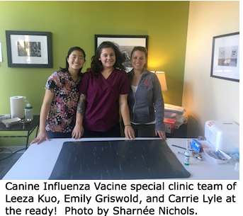 We are strongly recommending the Canine Influenza vaccination for dogs who have frequent dog-to-dog contact. Our CIV vaccination protects against both the current strain H3N2, as well as H3N8. The mechanism for getting your dog vaccinated is different for new clients versus current clients who are up to date with their dog’s yearly wellness exam. Clients with dogs who are current on their annual exams can make an appointment for one of our special vaccine clinics.